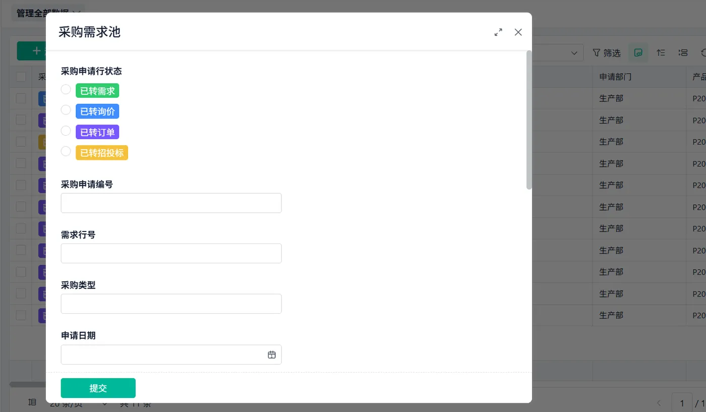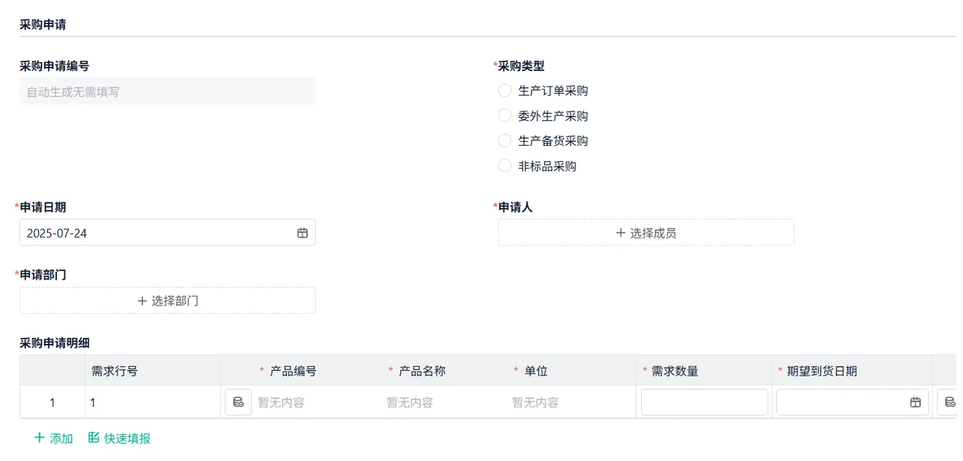 采购申请单是采购需求管理模块中的一个重要组成部分。员工或其他相关人员通过填写采购申请单来提出自己的采购需求。申请单通常包括以下几个字段:
