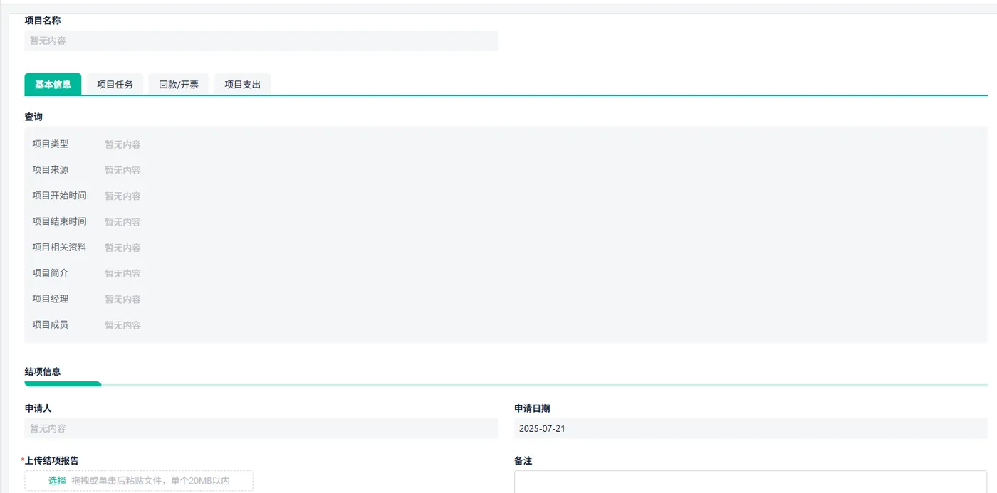 - 填写表单:填写项目基本信息、结项时间、验收人、备注,提交。
