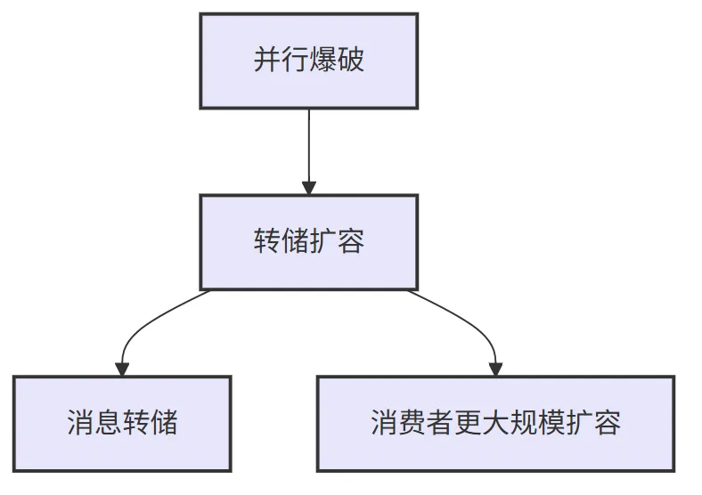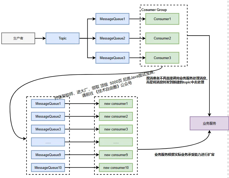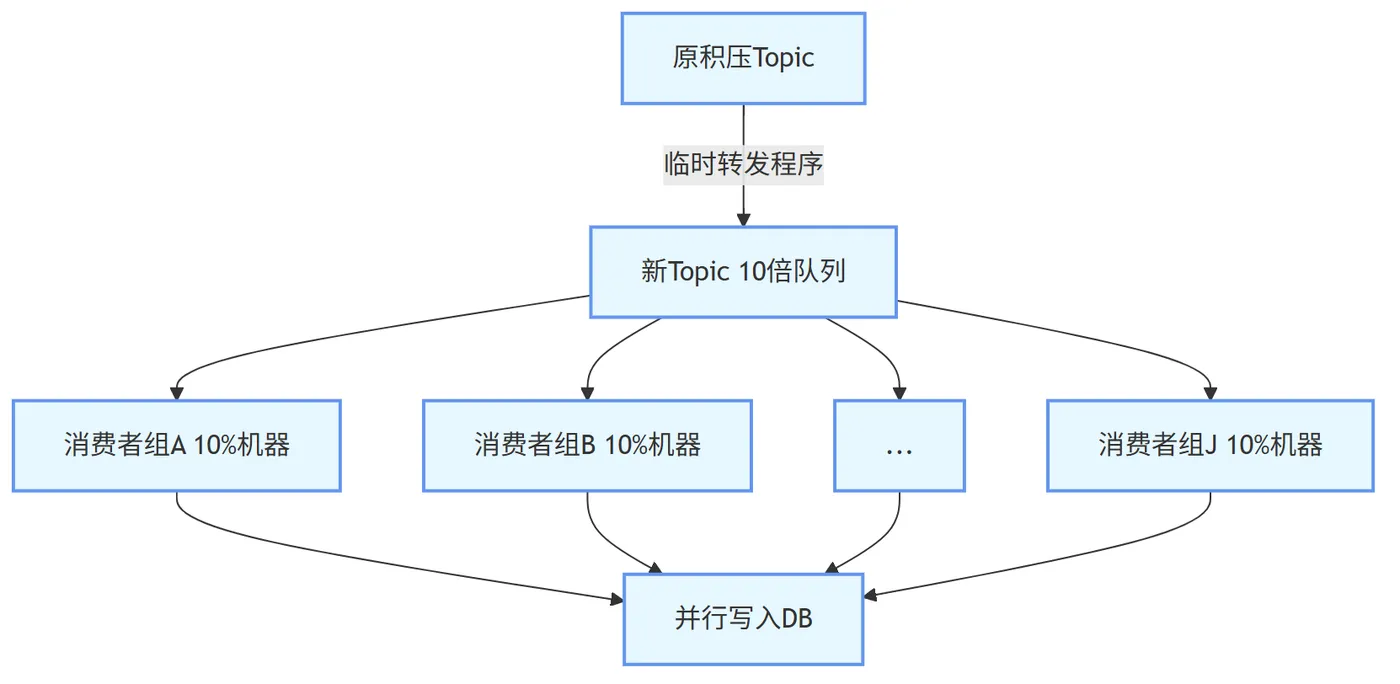 对应扩容Consumer(10倍),每个Consumer消费一个临时队列,同时扩容依赖的业务服务(如缓存、数据库);