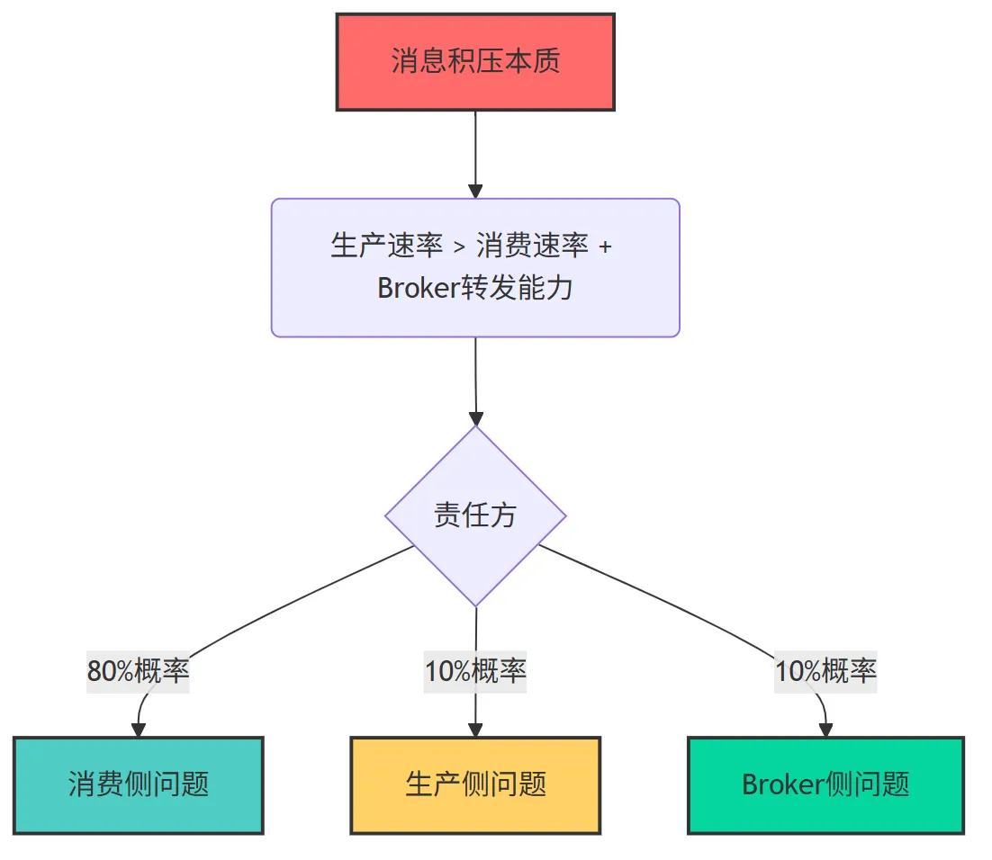 消息积压本质是“生产速度>消费速度+Broker转发能力”。