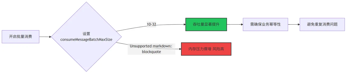 批量消费参数固化:consumeMessageBatchMaxSize固定为 16-32(经实测,此范围吞吐量提升最明显,且内存可控);