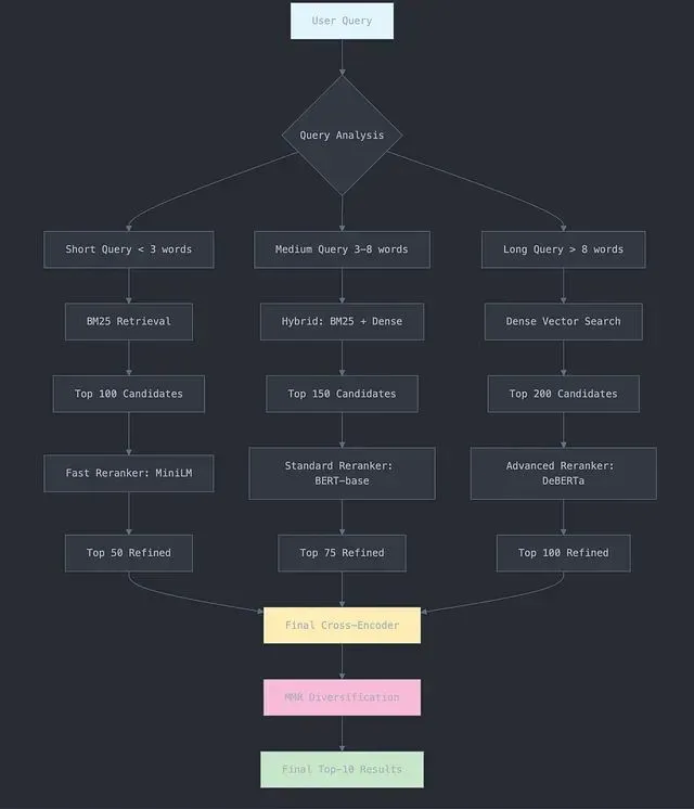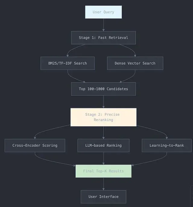 在生产环境中最为成功的系统通常采用多种重排序技术的组合策略,通过复杂的流水线架构实现效率与效果的双重优化。这种混合策略能够充分发挥不同算法的技术优势,在保证高质量结果的同时维持系统的响应速度。