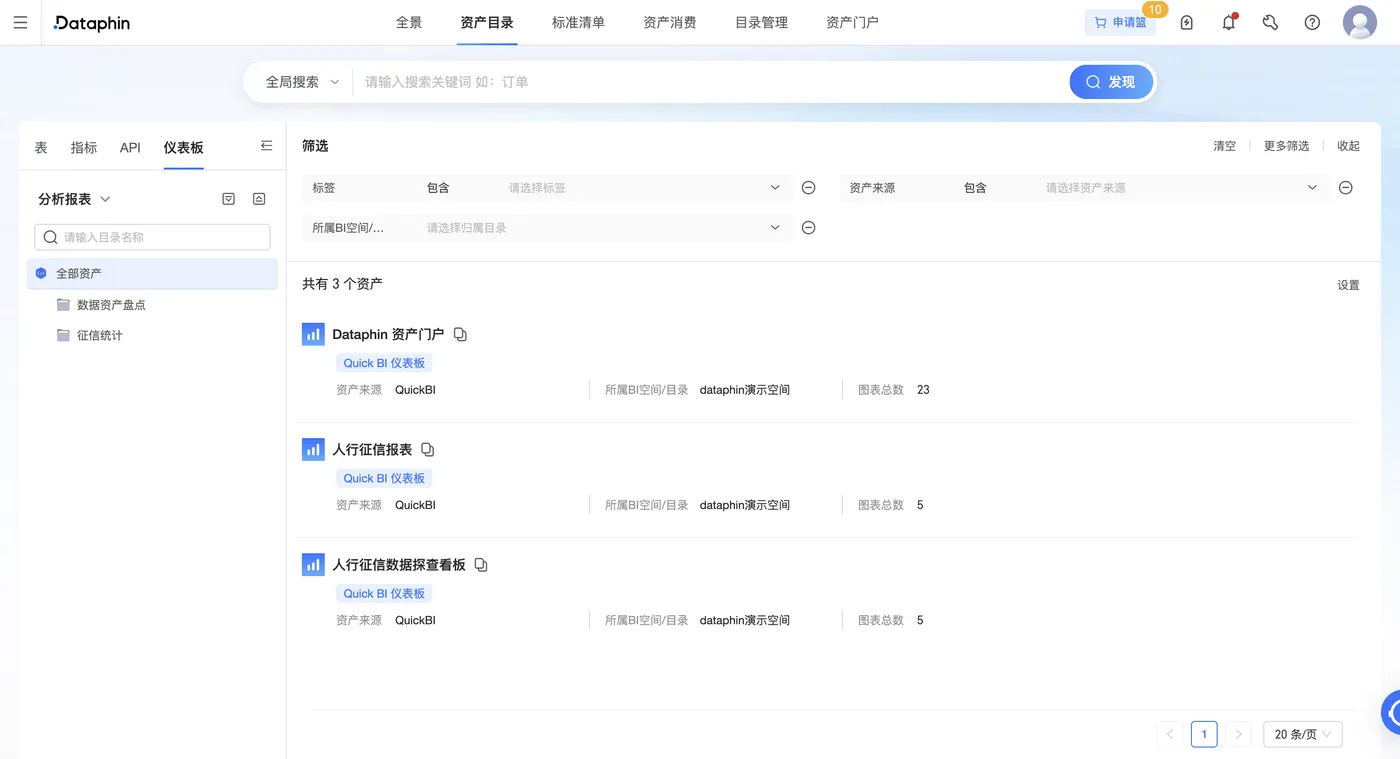 Dataphin通过采集BI系统中的报表元数据,可以对报表资产进行信息完善和上架管理,帮助业务人员和数据管理者更清晰地了解数据流向,助力构建企业统一的数据资产门户。下面,我们以QuickBI为例,展示报表资产的采集和管理。