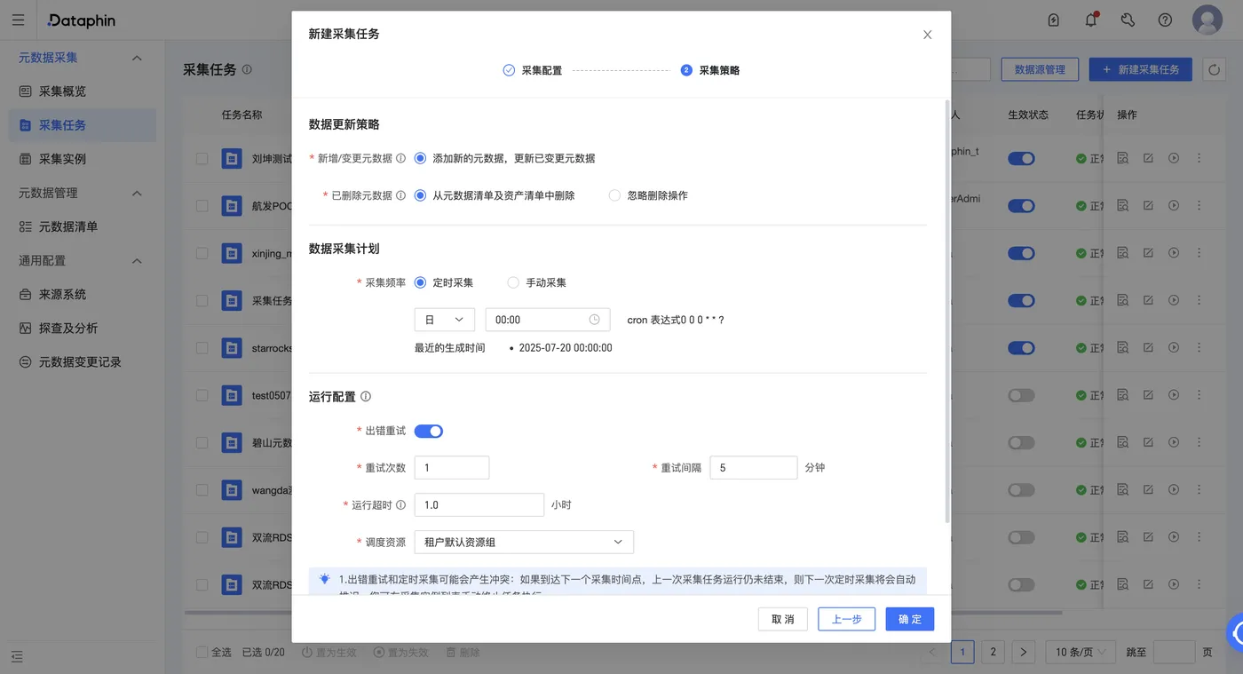 - 在「治理」-「元数据」-「采集任务」中,为刚刚配置的应用系统创建采集任务,可以按照QuickBI的工作空间进行圈选采集范围。
