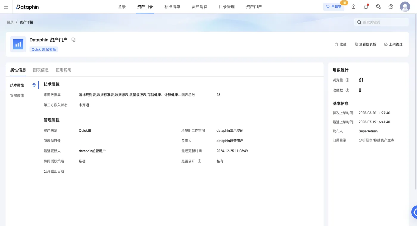 - 在资产详情页面,可以查看报表的技术、管理属性等元数据信息。点击「查看仪表板」,还可以一键跳转QuickBI。