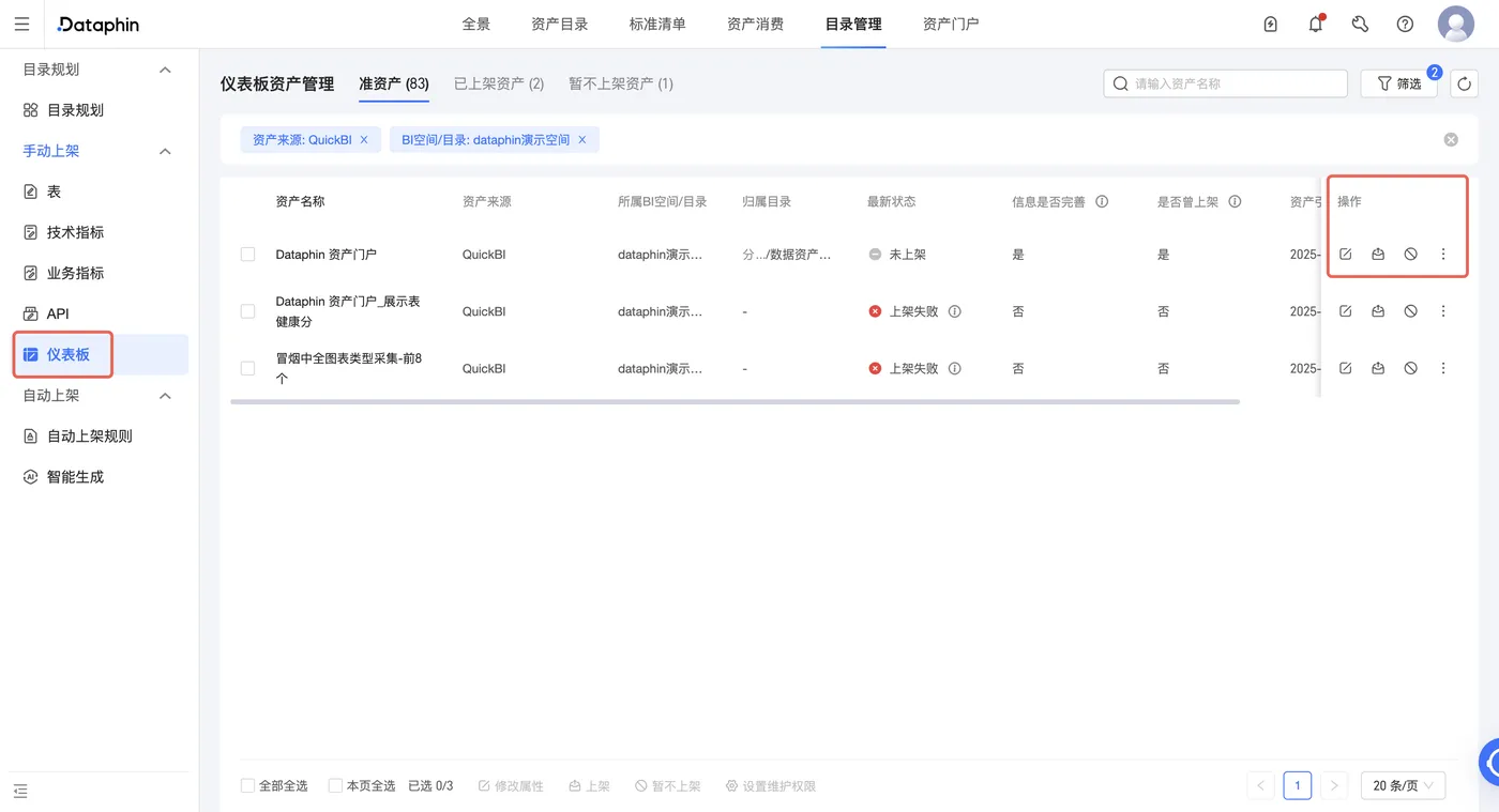 - 采集任务运行后,在「资产」-「目录管理」-「仪表板」中,可以对采集的报表资产进行信息编辑、上架等操作。
