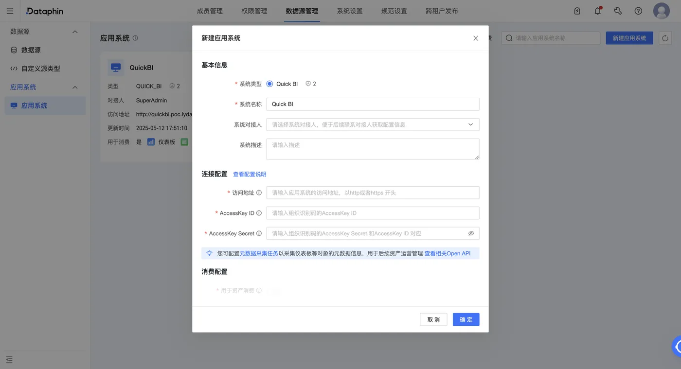 - 在「管理中心」-「数据源管理」-「应用系统」中,新建应用系统,注册BI系统的连接信息,如访问地址、AccessKey等。