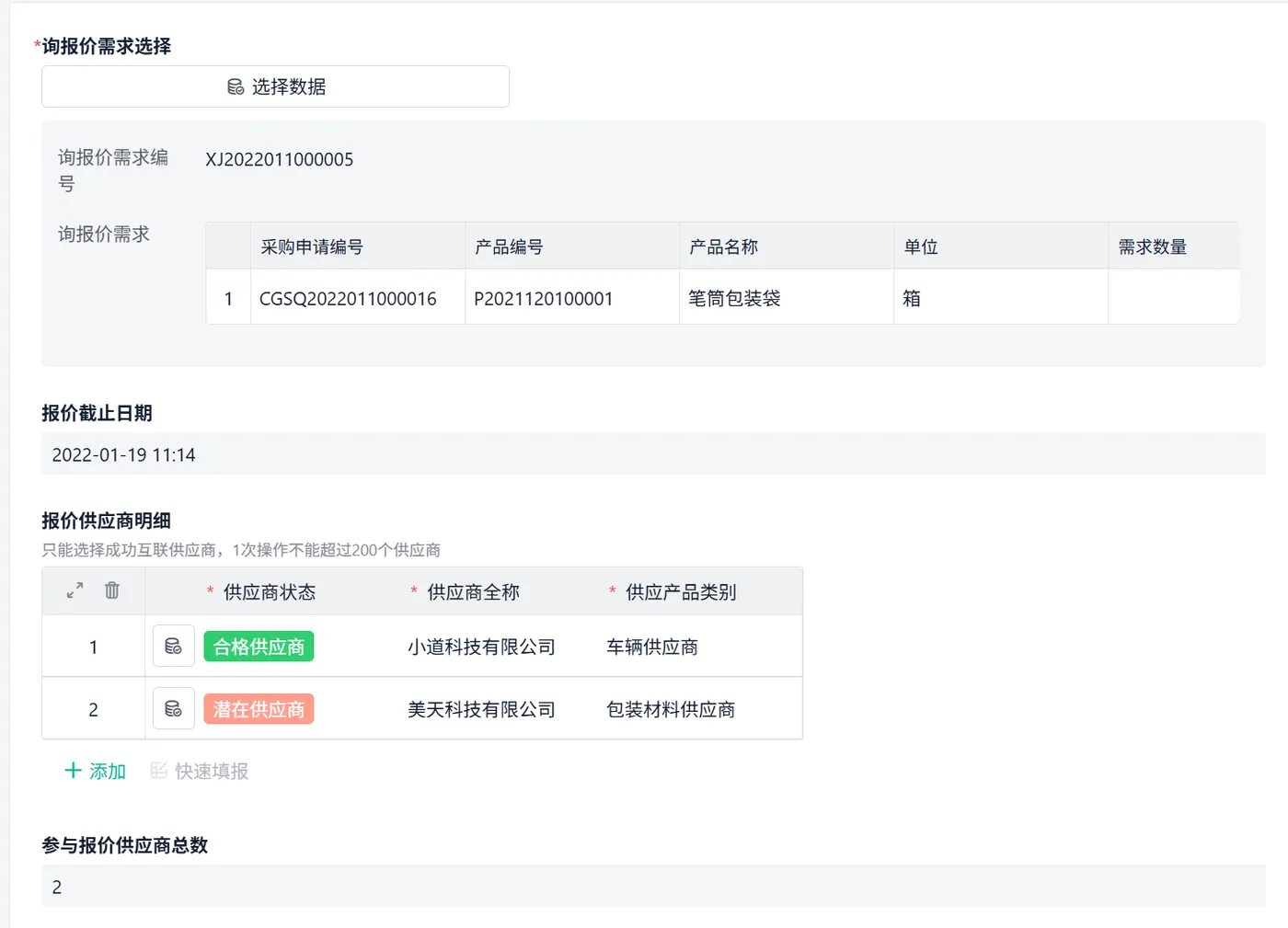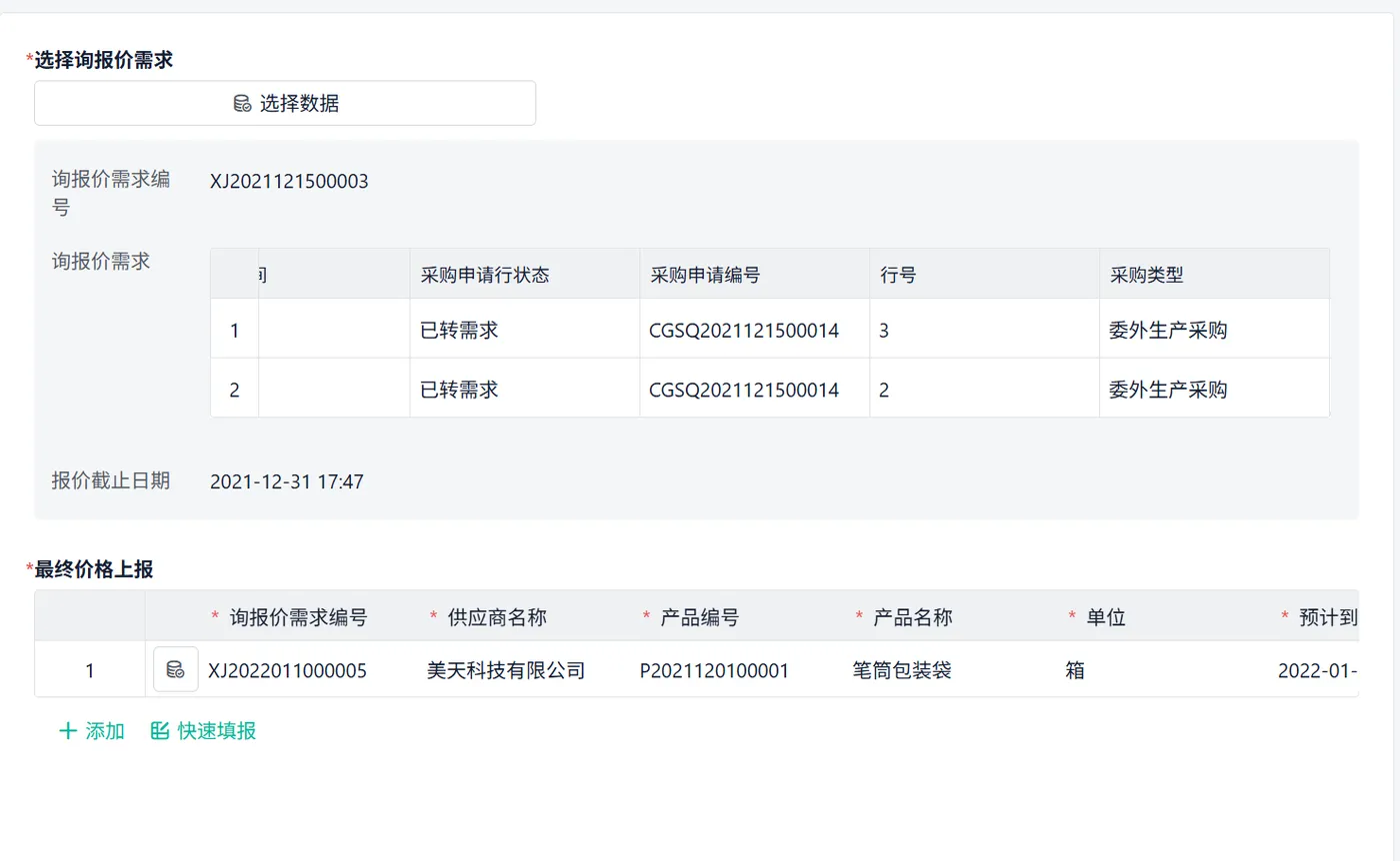 在这个表单中,采购选择要发起询价的产品 + 对应的供应商,一键触发报价流程。