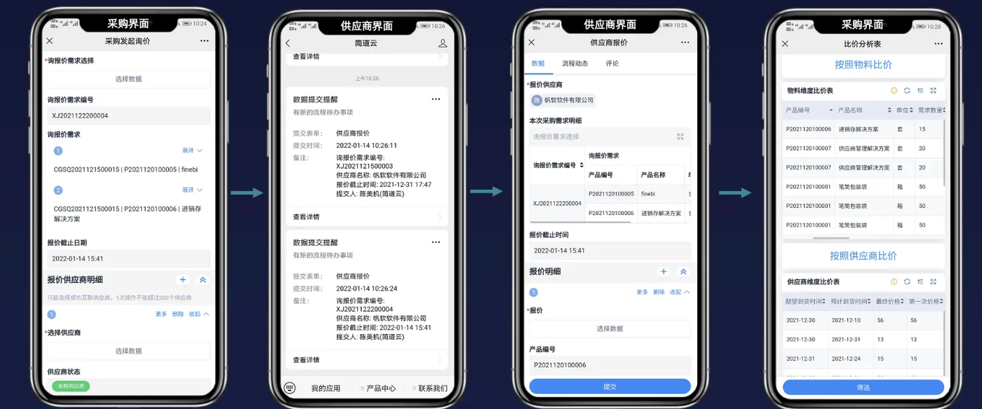 采购随时在线上一键批量发起询价,并自动通知到每个供应商,供应商点开询价通知,输入价格即可完成报价,系统自动汇总生成比价单。