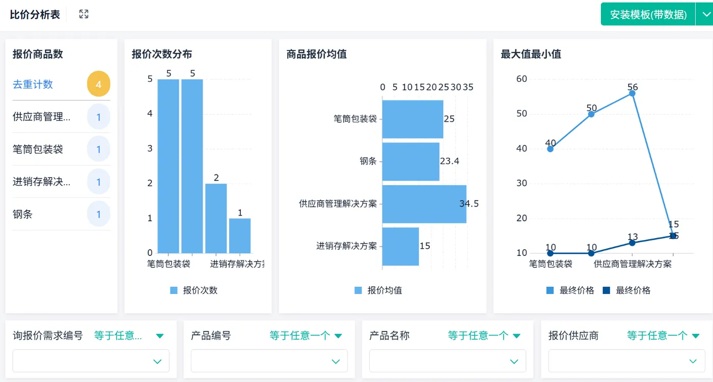 现在供应商一提交报价,系统就自动生成比价分析表,几个核心看板 + 两张明细表,一眼就能看出谁优谁劣。
