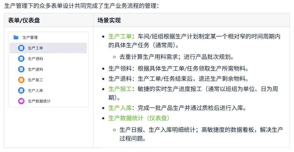 - 有生产流程:涉及工艺路线、BOM、计划排产、工序管理