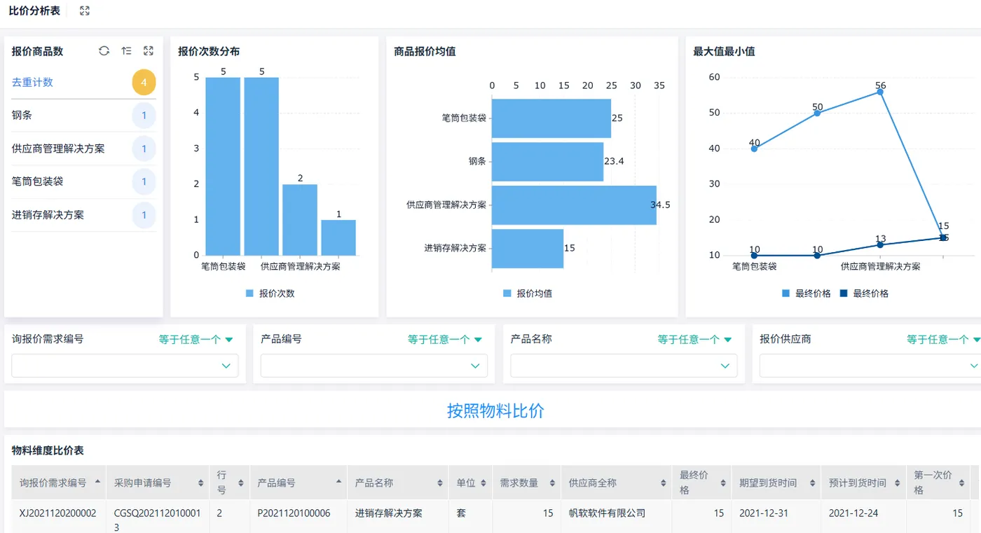 比价分析表功能用于对不同供应商提供的报价进行比对,帮助采购人员选择性价比最优的供应商。系统会根据价格、交货期、质量等多个维度进行分析。