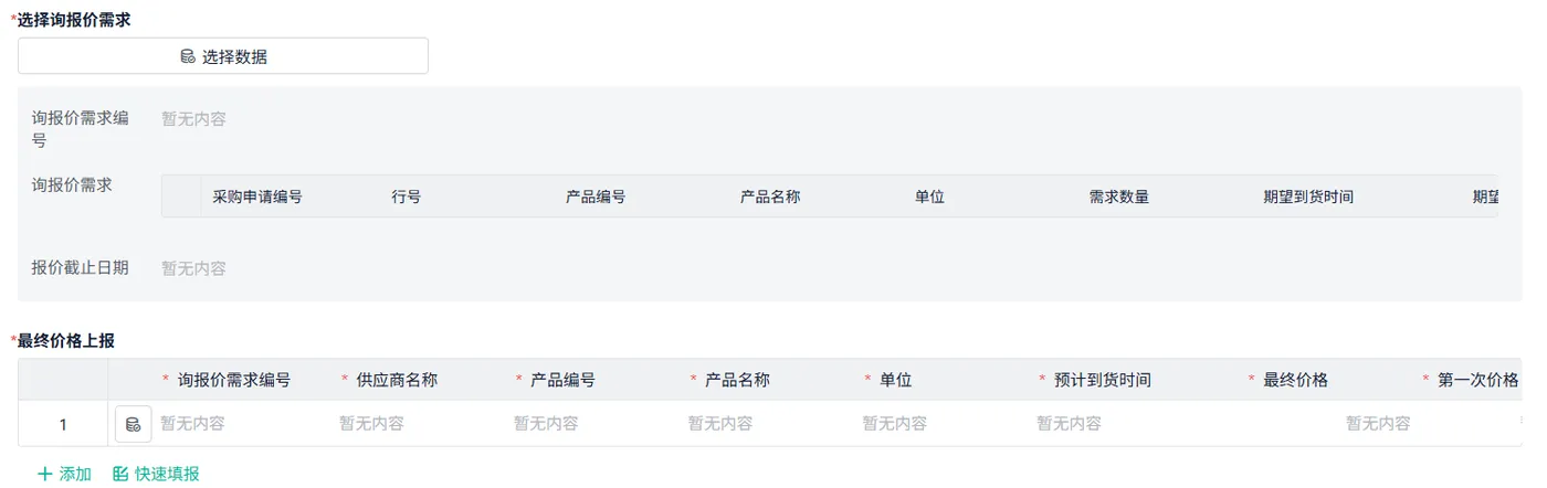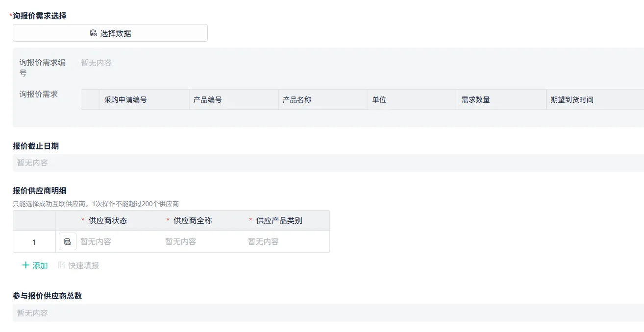 这一功能模块允许采购人员发起询报价流程,通常是根据公司的采购需求或项目需求发起。采购人员通过系统创建一个询价单,指定需要报价的商品或服务、数量、交货时间等详细要求。