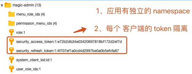 我的做法是所有的 Token 都通过 Redis 来存储,同时每个客户端都有独立的 namespace ,见下图: