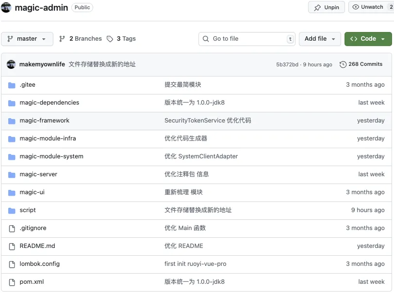项目的名称:magic-admin , 保留了 RuoYi-Vue-Pro 的基础功能 ,同时在客户端管理、代码组织结构、 多租户管理这三个层面做了定制。