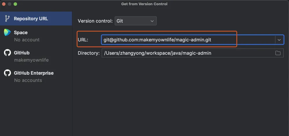 点击 Clone 后,URL 文本框填写项目的 HTTP 或 SSH 地址,比如 HTTP 的地址:git@github.com:makemyownlife/magic-admin.git