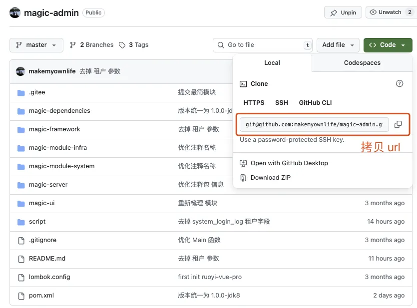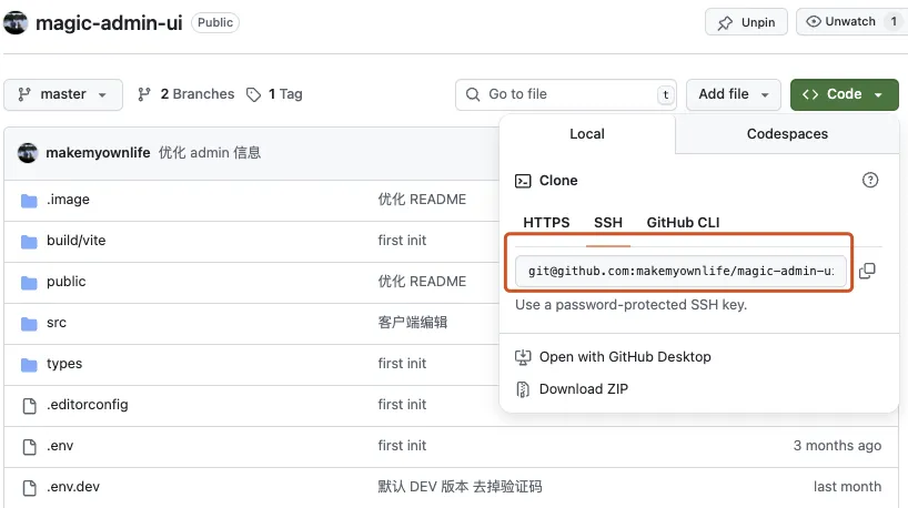 打开 Githu 项目地址:https://github.com/makemyownlife/magic-admin-ui 复制对应的 SSH 或 HTTP 克隆地址。