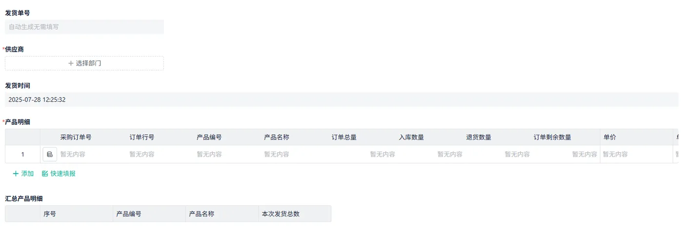 - 采购部门填写并提交发货申请