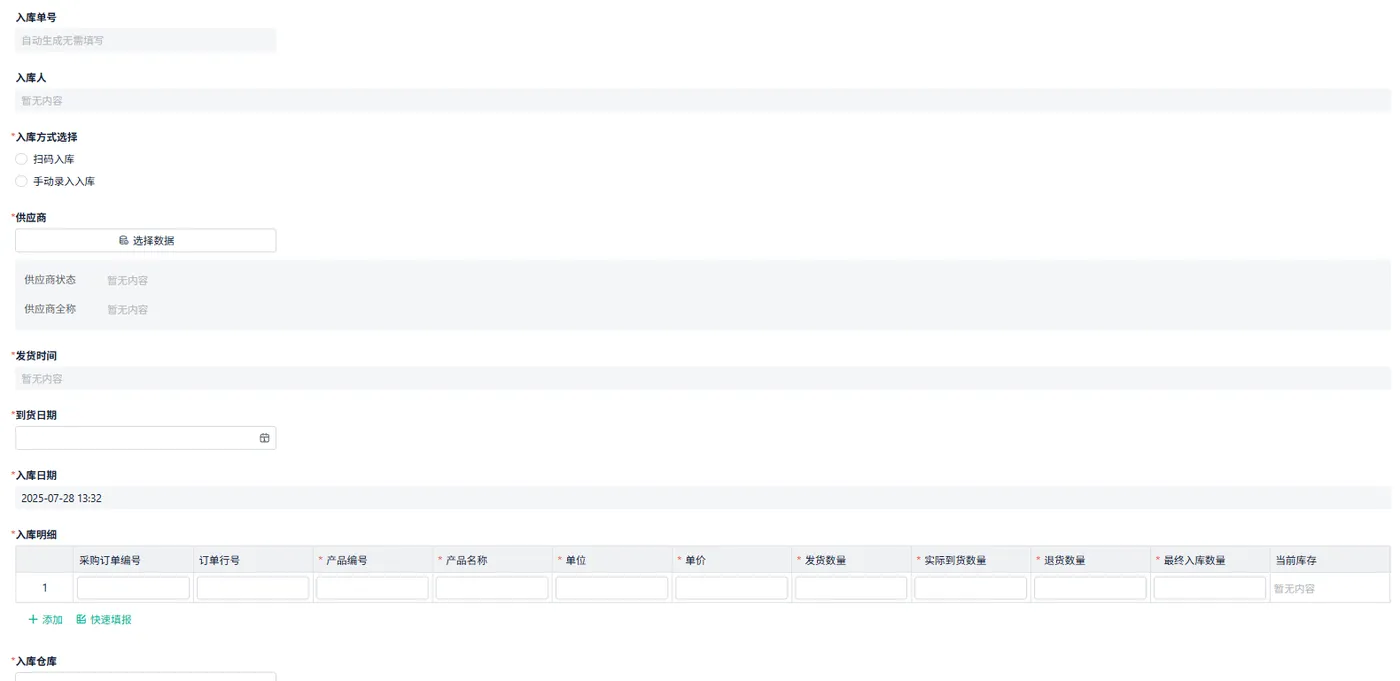 功能点 自动编号:规则 YYYYMMDD+4位流水 信息录入:供应商、产品、数量、批次、规格、价格 验收拍照:支持上传验收照片 状态跟踪:新建、验收中、已入库