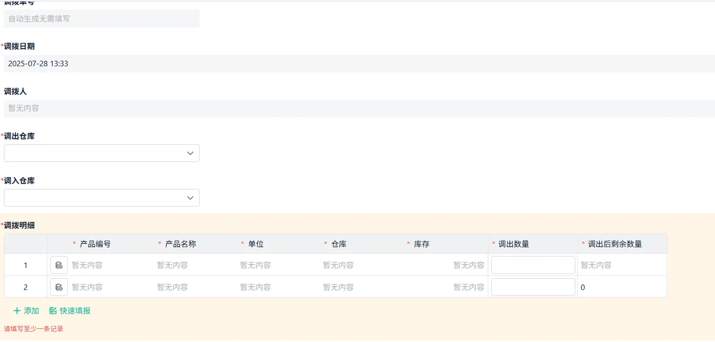 功能点 跨仓库调拨:支持调出仓库和调入仓库 审批机制:二级审批 自动库存更新