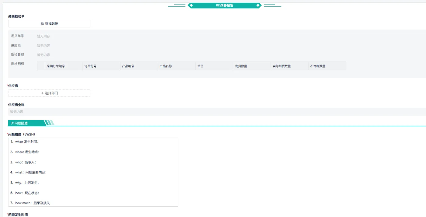 - 结构化保存:在数据库中为 8D 各阶段字段建立独立表或 JSON 字段,方便后续检索。