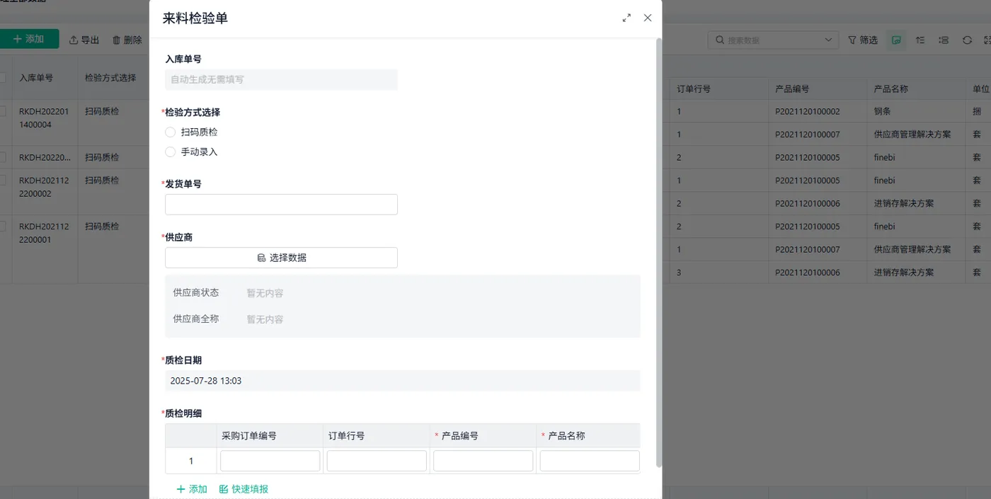 - 采购模块:发起采购订单后,自动触发来料检验单生成;