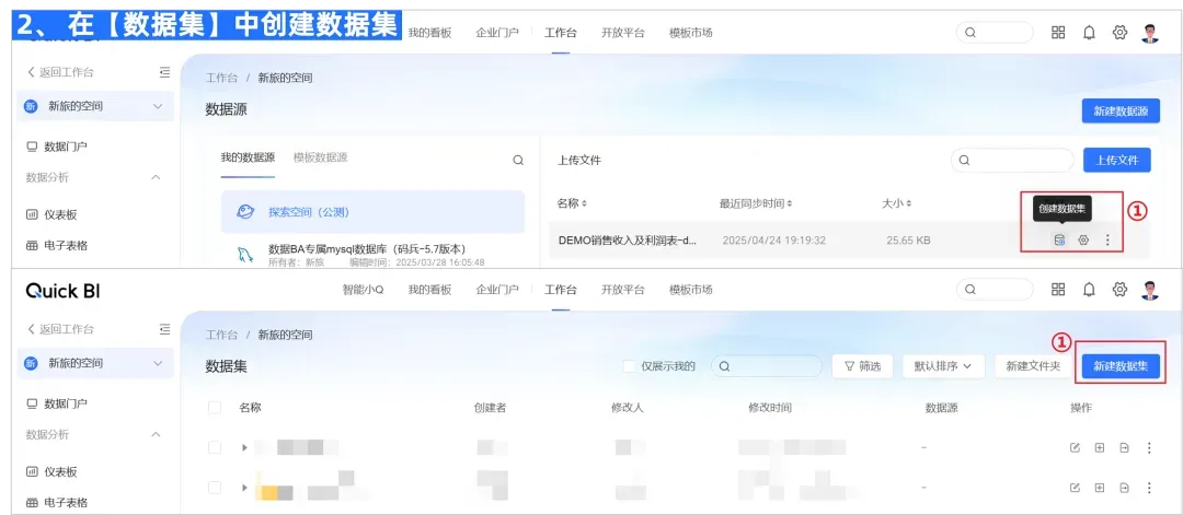 2. 【数据集创建】完成数据源接入,点击创建数据集快速完成数据集创建。