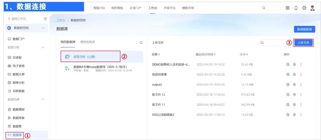 1. 【数据连接】开通数据服务,并连接数据源,以本地文件源为例,点击上传文件即可完成数据接入。