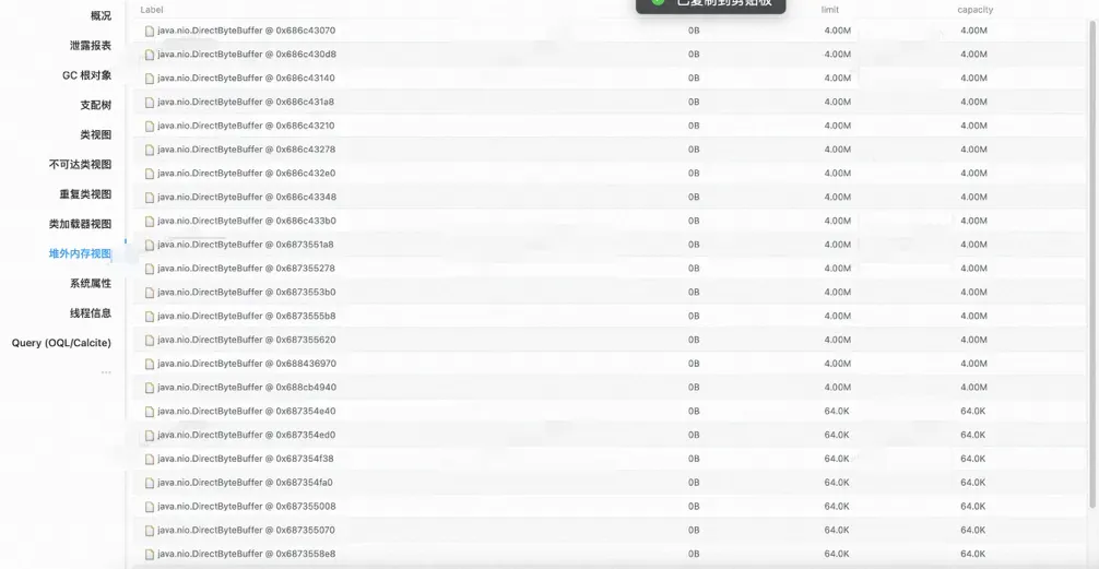 使用集团内部的MAT文件,分析了Dump文件,发现堆外内存中都是java.nio.DirectByteBuffer。