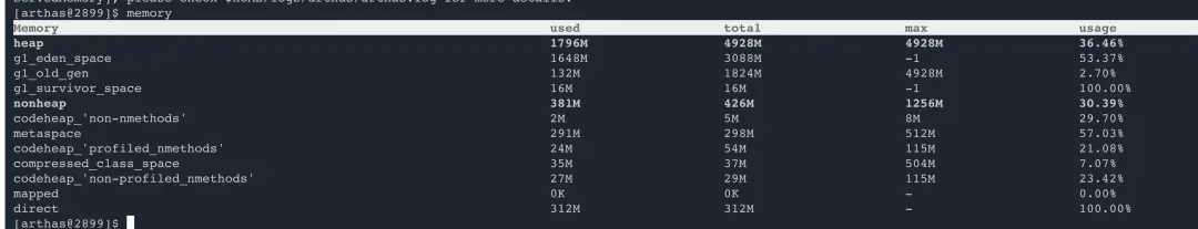 使用Arthas 的 memory 命令分析了系统的内存分布,结果如下: