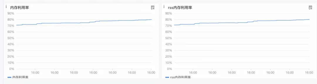 从图中可以明显看到,机器A的内存利用率基本是呈阶梯状,每隔一段时间就会上涨一部分;机器B的内存利用率并未有什么大的变化。