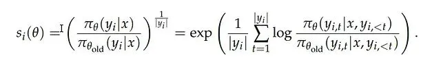 序列级重要性比率s_i(θ)衡量新策略相对于旧策略生成完整序列y_i的概率比值。算法设计的关键在于引入了长度标准化机制(指数项中的1/|y_i|),确保重要性比率在数值上保持稳定,无论序列长度为10个令牌还是1000个令牌。