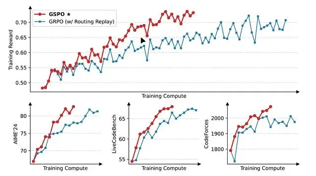 训练稳定性和性能对比实验(图1)表明,在相同计算资源配置下,GSPO相比GRPO展现出更优的训练稳定性和基准测试性能。训练曲线清晰地反映了GSPO的优势。