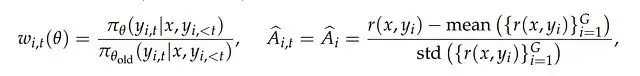 权重w_i,t(θ)表示新策略相对于旧策略生成特定令牌y_i,t的概率比值,每个令牌的梯度更新通过w_i,t(θ) * Â_i进行调整。