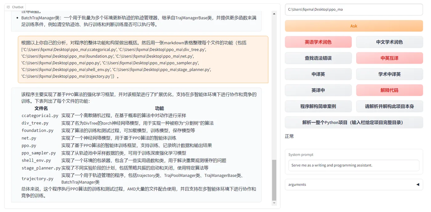 gpt_academic(GPT 学术优化)正是为此诞生:聚焦论文生产全流程,从阅读理解、翻译润色、结构优化,到理工项目剖析,提供一站式解决方案。