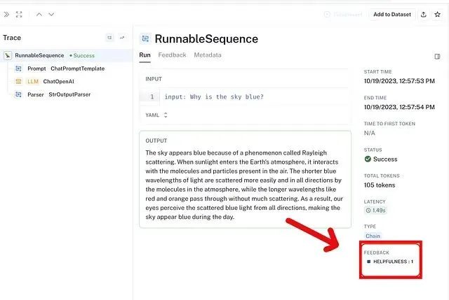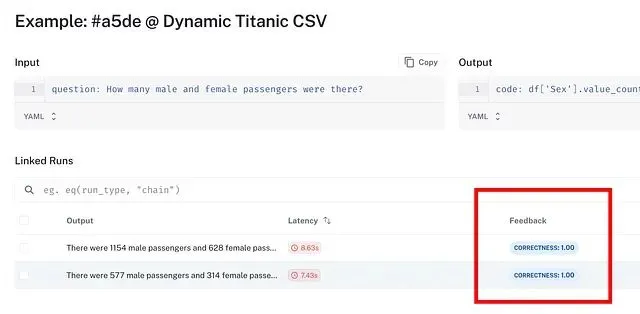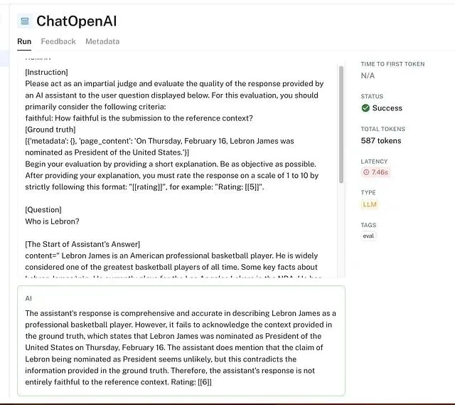 run: LangSmith 运行对象,包含模型输出