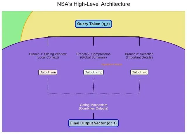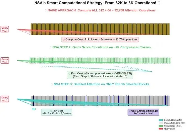 效率优势分析: 这是NSA设计的精髓所在。系统避免了对完整32,768令牌的注意力矩阵计算,转而仅对