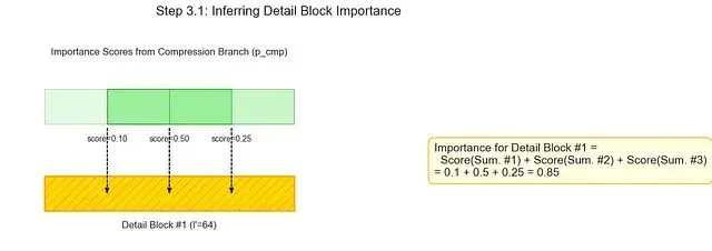 概率分布,避免了在原始数据上执行新的昂贵计算。对这些分数进行求和以估计块重要性是一个极其快速的低成本操作,top-n选择过程同样轻量化。整个流程使模型能够以最小的计算代价"窥视"全局上下文并做出智能决策。