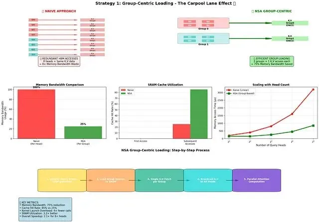 在现代分组查询注意力(GQA)架构中,多个查询头共享相同的键和值矩阵。NSA的内核专门针对这一特性进行优化。