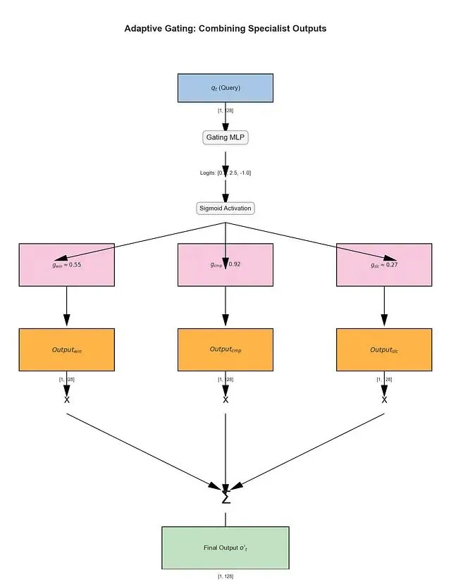 作为输入,为每个分支生成相应的"门控"分数。通过Sigmoid激活函数确保这些分数处于0到1的范围内,使其能够作为各分支输出的权重系数。