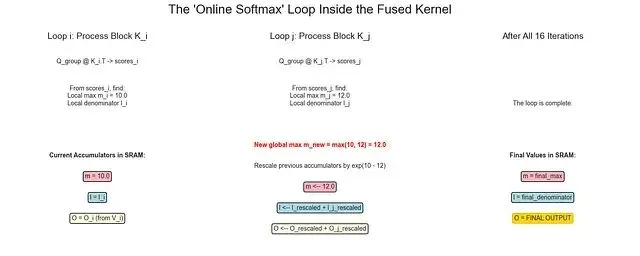 在GPU上启动独立操作会产生额外的调度开销。NSA的选择注意力内核采用"融合内核"设计,将多个计算步骤合并为单一的连续操作。这种设计在Softmax计算中表现最为明显:系统不存储完整的