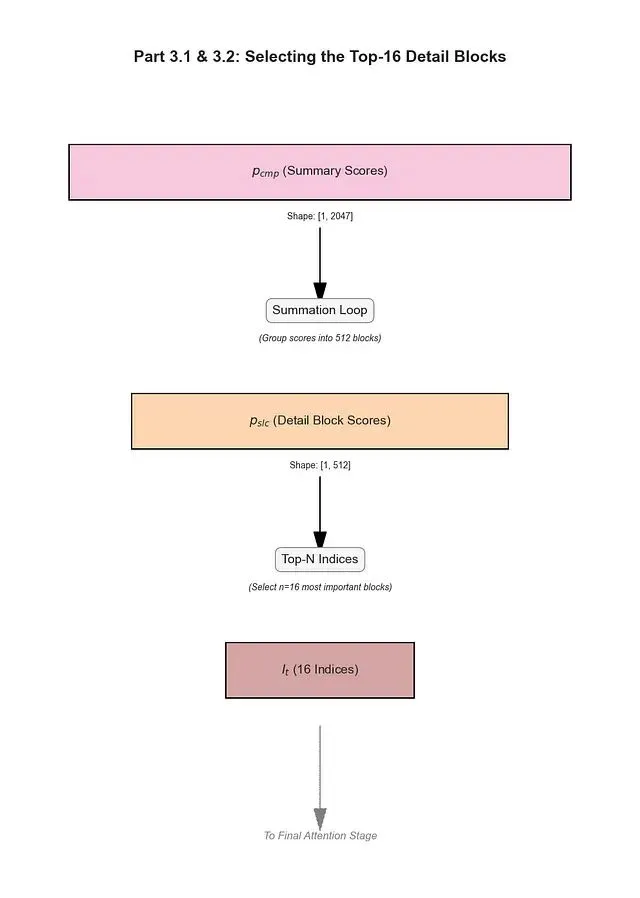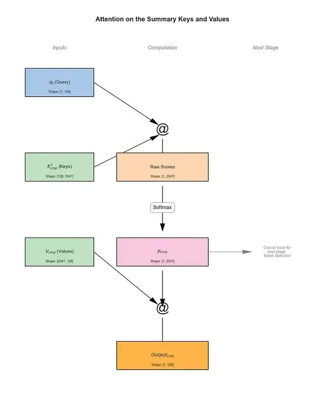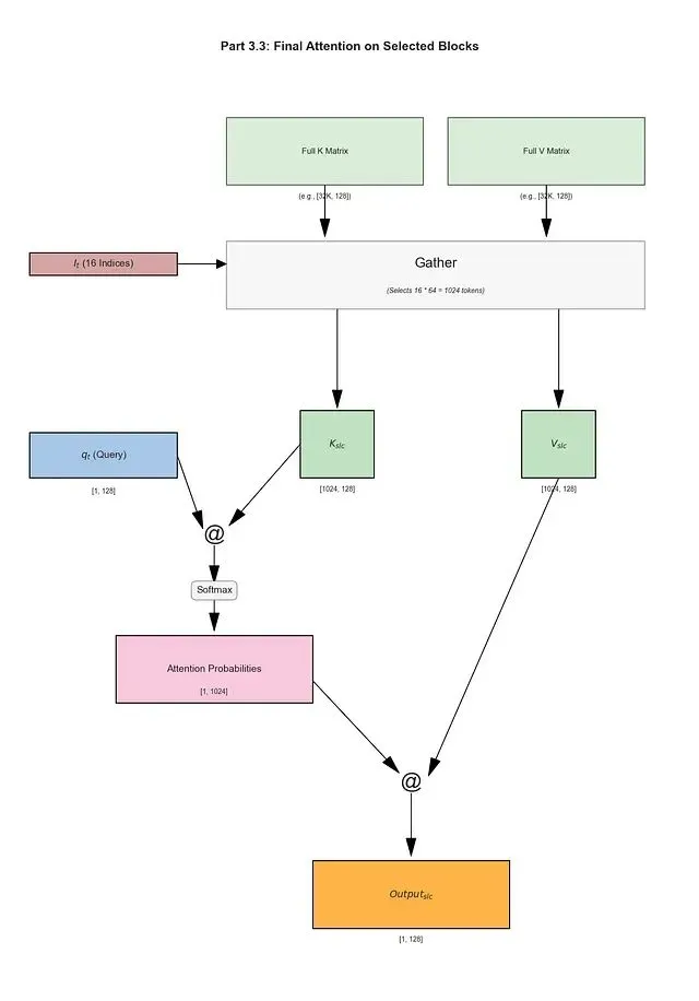 第二部分和第三部分的核心要点:压缩注意力仅对2K摘要令牌进行处理,并利用此结果从原始键值矩阵中选择1K令牌进行精确注意力计算。