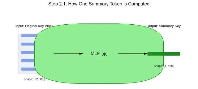令牌的步长滑动,每一步生成一个新的绿色"摘要令牌"。此过程同时应用于键(K)和值(V)向量。需要注意的是,系统并非简单平均,而是使用MLP进行智能映射,下图展示了32个键向量如何映射为1个摘要键向量的过程。