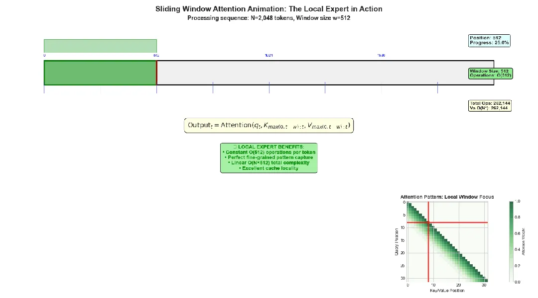 设计目标: 滑动窗口分支旨在完美保留最近本地上下文中的细粒度信息,确保模型对当前位置附近的语义关系具有高精度的理解能力。