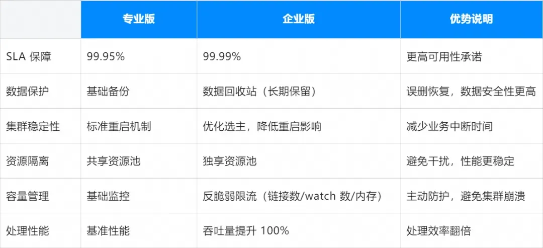 阿里云微服务引擎 MSE ZooKeeper 企业版正式发布,提供比专业版更高的稳定性与安全能力,SLA 达 99.99%,整体服务性能提升 100%。针对关键业务,企业版通过独享资源池实现更高规格配额,满足大规模需求。此外新增数据备份容灾、容量管理反脆弱限流等功能,提升整体企业级特性,助力企业应对复杂业务挑战。