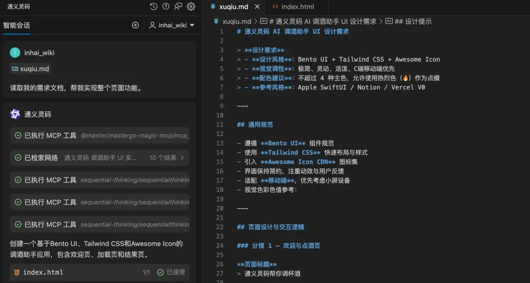 而这款会讲故事、有情感的 AI 调酒师的页面开发,是由融合通义灵码的 Qwen3-Coder 代码模型搭建而成,并通过灵码调用阿里云百炼的大模型服务,为用户提供趣味化、定制化的互动体验。