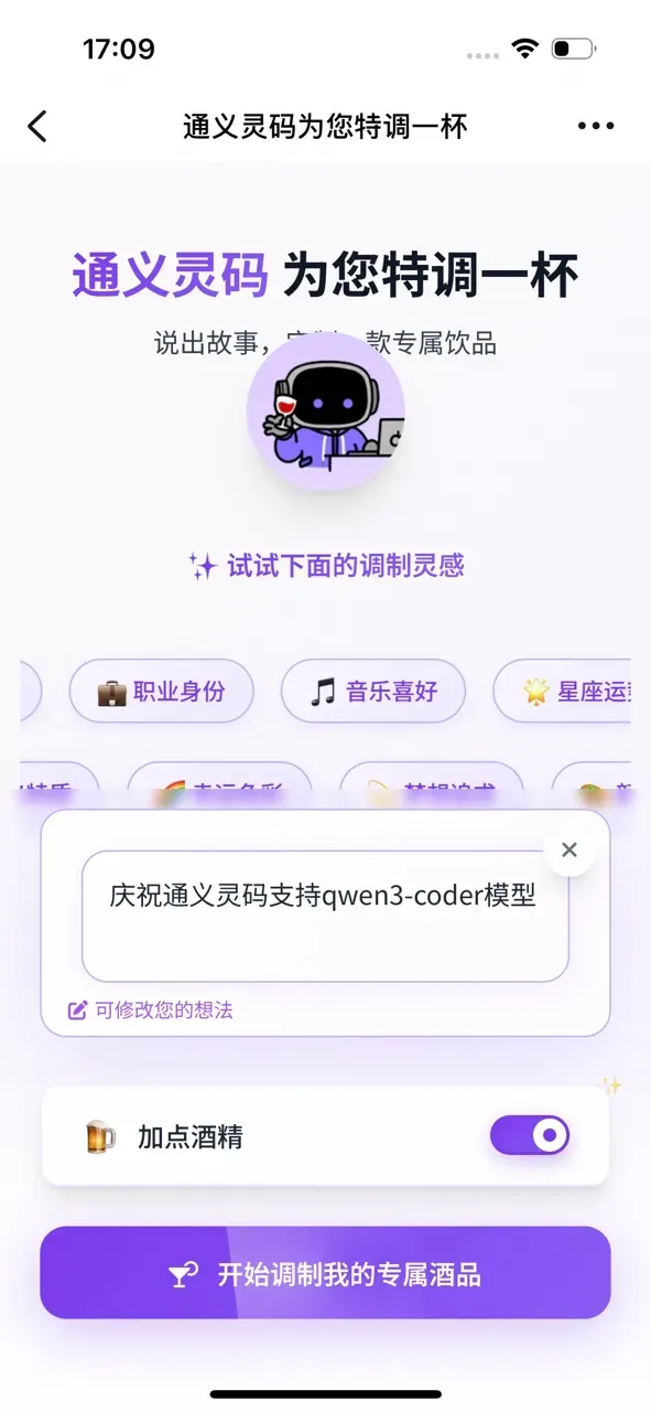 第一步:输入你的特调需求,可以是今日心情、也可以你部门产品、甚至你自己的名字;