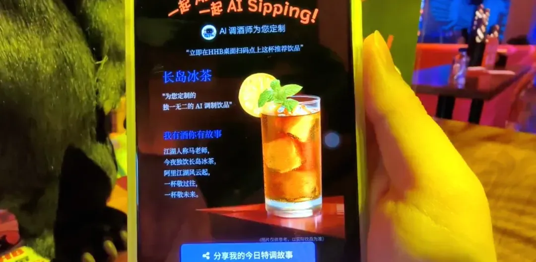 7 月 29 日,马老师的 HHB 音乐酒吧在阿里巴巴西溪园区正式开业,开业这天迎来了一位神秘嘉宾“AI 调酒师”!