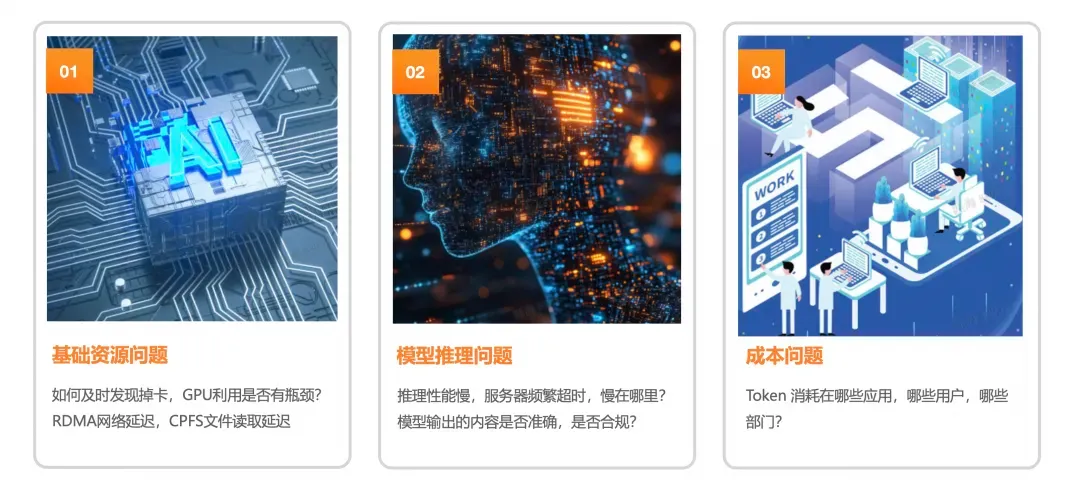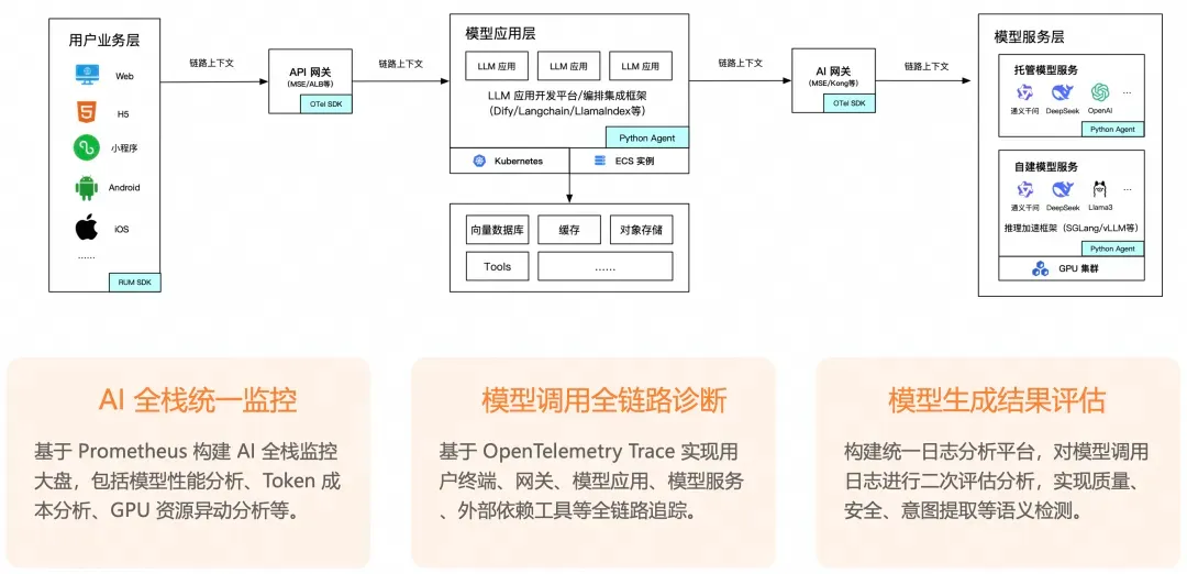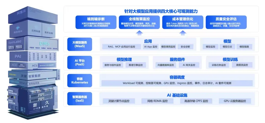 从最底层智算服务器,提供基础设施的监控能力,到通过容器服务自行部署的一些模型能力,再到 AI 平台像 PAI 这样的 PaaS 产品,覆盖了从训练到推理的各个阶段,到像百炼这样的大模型服务平台 MaaS,以及再往上到 AI 应用开发,都能够有一个从上到下的立体化的一个全栈的可观测的能力。