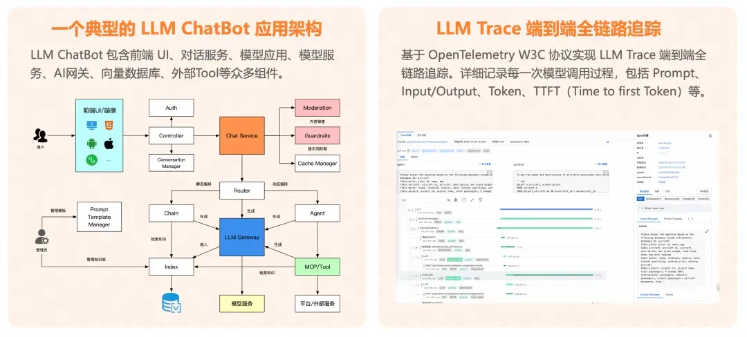 第一个就是我们在刚才说的在 AI 应用开发框架中,在一些常见的开发框架的支持上是最为全面的,包括大模型的一些核心指标。TTFT/TPOT 等指标,以及在模型的输入输出这些数据上,做了一个非常完整的支持,包括流式场景下的数据采集能力也是完整的支持。